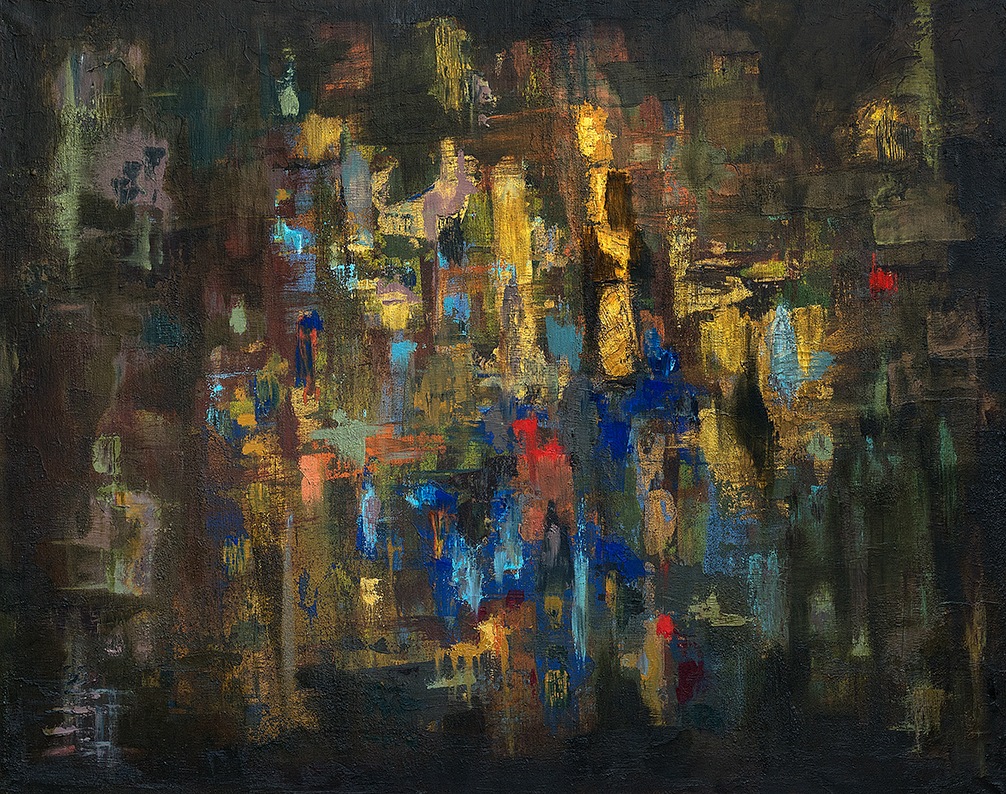 Immerse yourself in the play of color. Let your eyes dance between the multitude of shapes. Don’t try to explain everything, but allow the painting to sweep you away in undulating beauty. Discover the other part of yourself and see and listen to what the painting wants to tell you.
